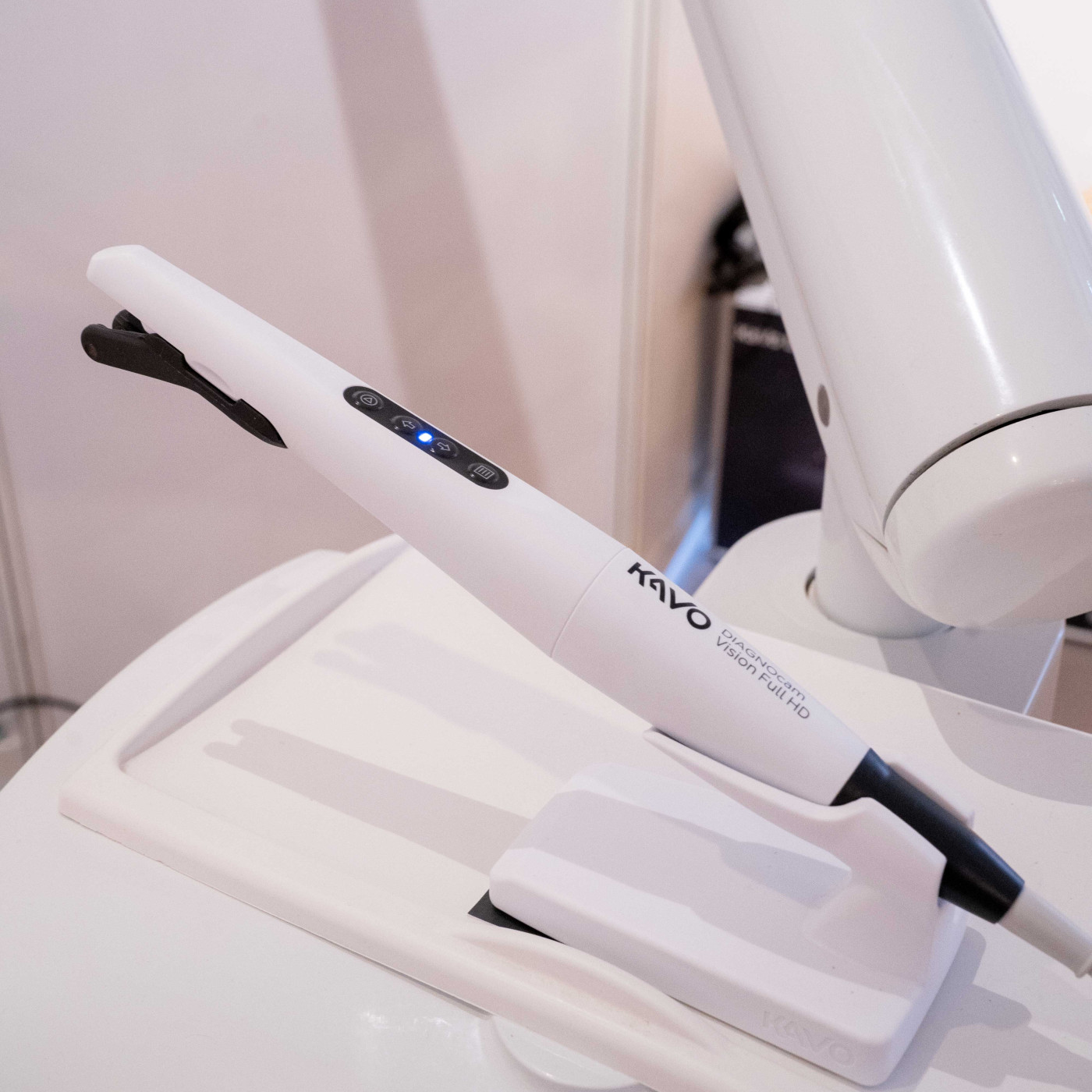 Während des Checks verwendete der Zahnarzt die DIAGNOcam Vision Full HD von KaVo, die das Medizintechnikunternehmen extra zu diesem Zweck zur Verfügung gestellt hatte. Die Kamera erzeugt mit einer Aufnahme sowohl hochauflösende Intraoral- als auch Transilluminations- und Fluoreszenzaufnahmen.