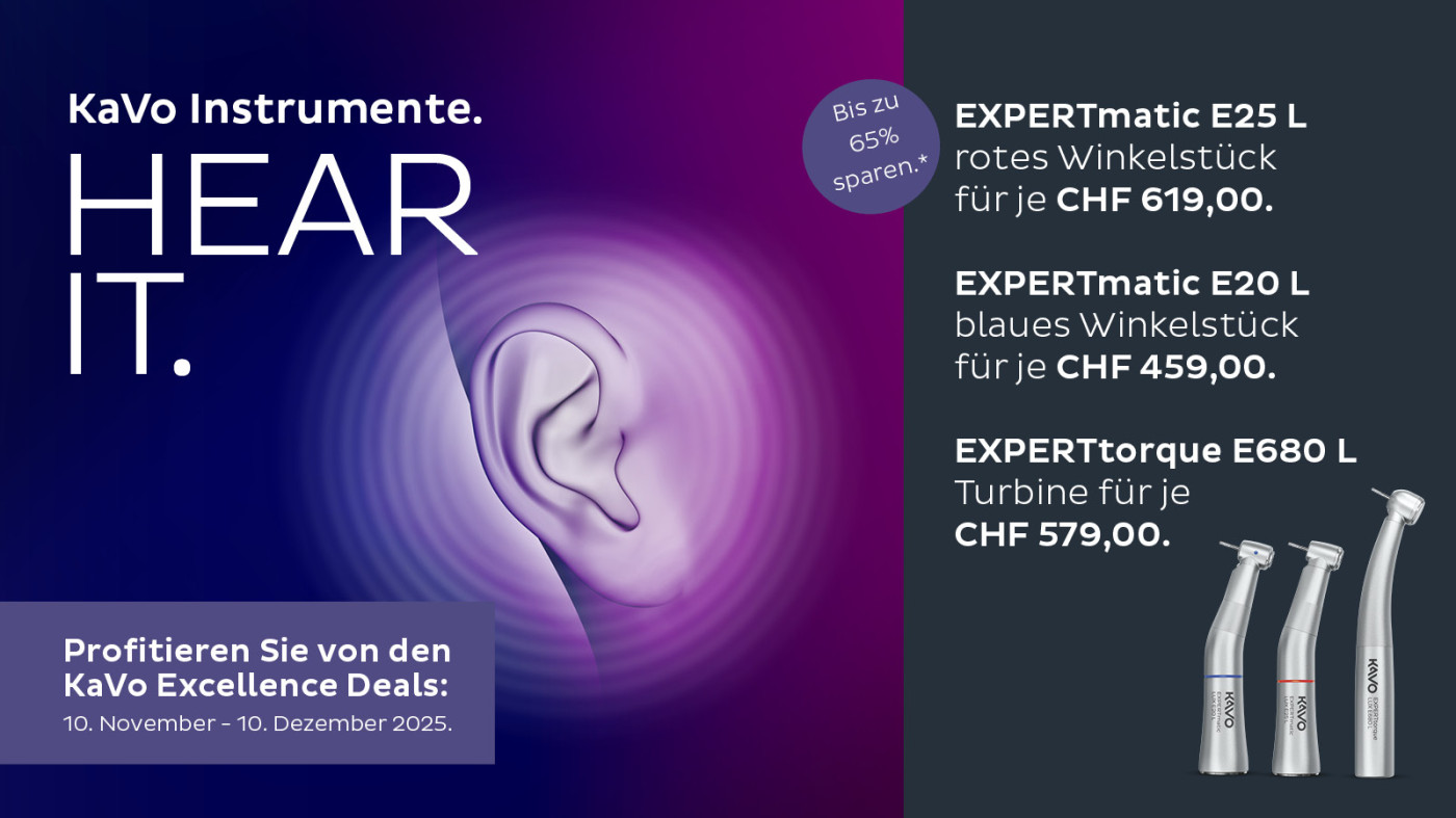 Nutzen Sie jetzt Ihre Chance: Erleben Sie erstklassige KaVo Qualität, intelligente Ergonomie, höchste Hygienestandards – und vor allem: ein Hörerlebnis, das Maßstäbe setzt.