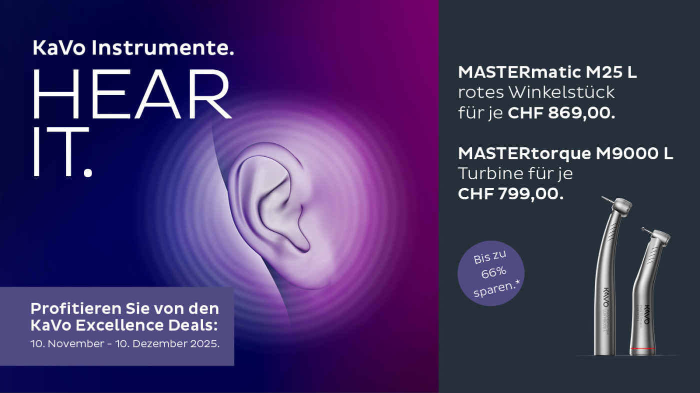 Hörbar KaVo: KaVo Instrumente stehen für besonders gehörschonendes Arbeiten. Die einzigartige Produktarchitektur kombiniert mit ausgewählten Materialien, innovativer Lagertechnik sowie schall- und vibrationsdämpfendem Design sorgt für eine geräuscharme Behandlung. KaVo Instrumente sind einzigartig. Für entspanntes Arbeiten, entspannte Ohren und ein spürbar besseres Gefühl im Praxisalltag.