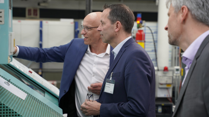 Der Geschäftsführer Armin Imhof (v. links), Thomas Dörflinger und Geschäftsführer Oliver Krett während der Werksführung in der Produktion am Standort Biberach.