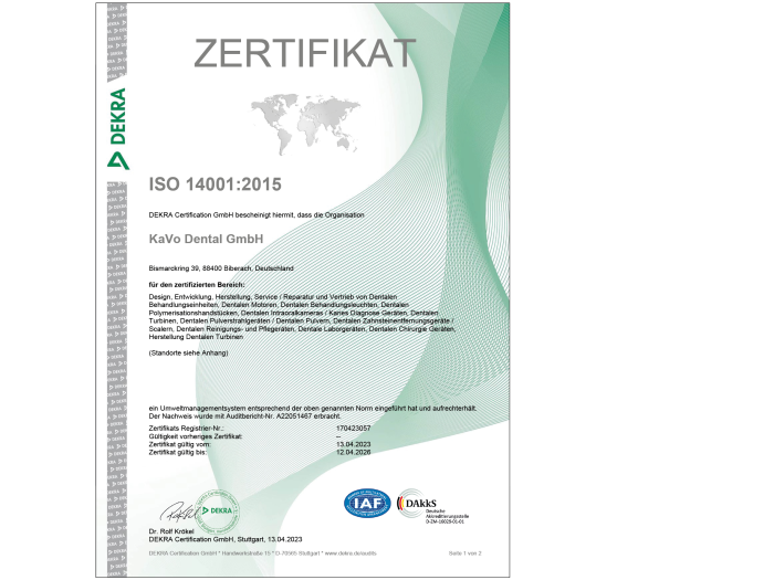 Auch in puncto Umweltmanagement setzt KaVo auf Exzellenz: Mit einem ambitionierten mehrstufigen Umweltschutzplan, der in dem Umweltmanagementsystem gemäß der DIN EN ISO 14001:2015 und fest in der Unternehmenspolitik verankert ist, wird KaVo in Zukunft noch nachhaltiger.