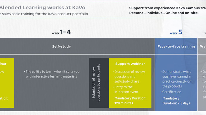 Bei KaVo besteht das Blended Learning Training aus drei zentralen Lernmethoden: Während der Selbstlernphase eignen Sie sich selbstständig das nötige theoretische Wissen an. Ergänzende Begrüßungs- und Betreuungswebinare unterstützen Sie in dieser Phase optimal. Im abschließenden Präsenztraining wenden Sie Ihr Wissen dann direkt und interaktiv am Produkt an - so können Sie die Lerninhalte schnell verinnerlichen und direkt abrufen.