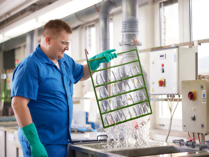 Ich habe während meiner Ausbildung alle Prozesse in der Produktionsabteilung Galvanik kennengelernt: von der mechanischen Bearbeitung über die Vorbehandlung zu den galvanischen Prozessen, den analytischen Untersuchungen im Labor und der Abwasseraufbereitung. Qualitätsprüfungen, wie zum Beispiel mit Röntgenfluoreszenz-Verfahren, gehören natürlich auch dazu.