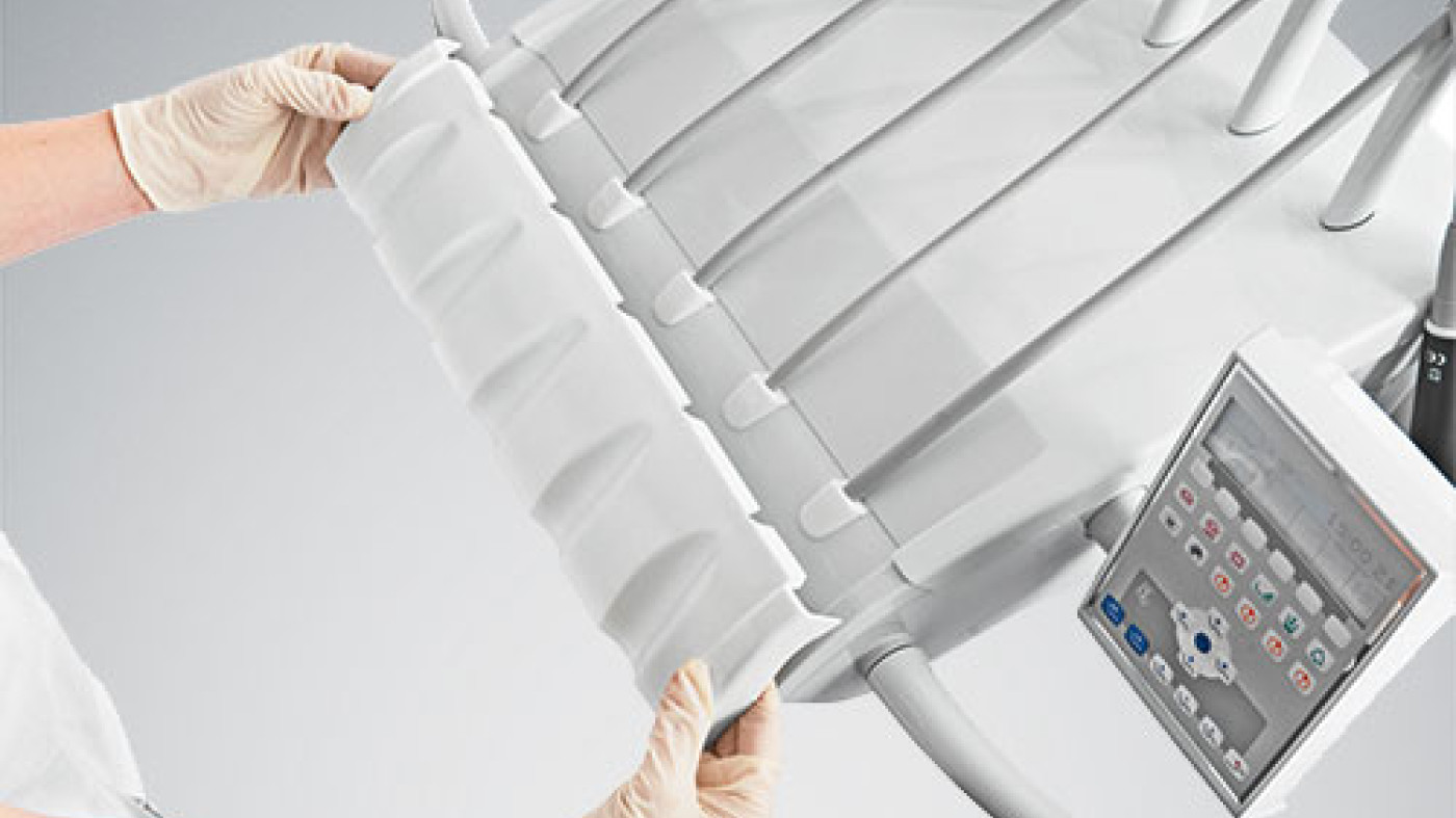 Griffe, Instrumentenablagen, Mundspülbecken, Schwingenbügel und Silikonmatten sind einfach abnehm- und desinfizierbar. Damit kein Schmutz in Ihre Behandlungseinheit eindringt, sind Gehäuseober- und -unterteil komplett geschlossen. Die Saugfilter sind dank Hygienegriff einfach und sicher wechselbar.
