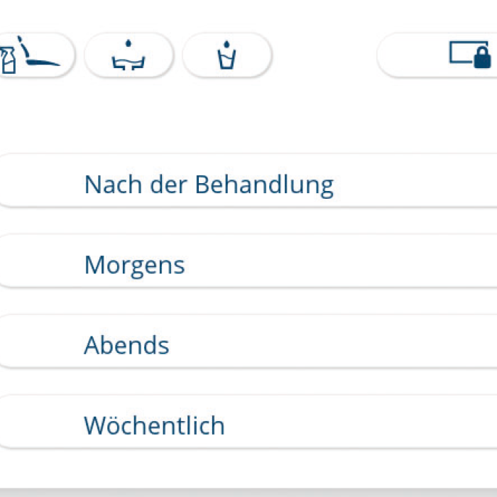 Mit den vorprogrammierten Reinigungsprogrammen bekommen Sie beste Unterstützung für die Aufbereitung Ihrer KaVo Dentaleinheit – und das entsprechend den RKI-Vorgaben. Der Hygiene Guide führt Schritt für Schritt durch die Vorbereitung der Einheit - egal, ob nach der Behandlung, morgens, abends oder wöchentlich. Für die Spülung und Reinigung der entsprechenden Komponenten sorgen die Programme dann ganz von allein.