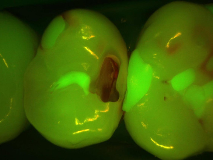 Das von dieser Wellenlänge erzeugte Bild lässt den gesunden Zahnschmelz hellgrün erscheinen, ähnlich wie die Schale eines grünen Apfels. Bereiche mit aktiver Karies leuchten rot, so dass sie schnell erkannt werden können.