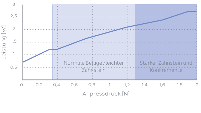 Erhöht der Behandler den Druck, um Zahnstein oder Konkremente zu entfernen, wird die Leistung dem Druck entsprechend kontinuierlich erhöht. Dadurch ist eine sanfte, angenehme und zeitgleich effektive Behandlung möglich.