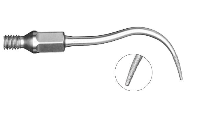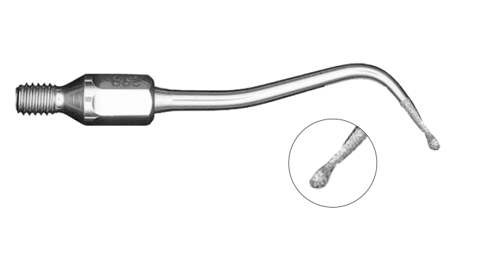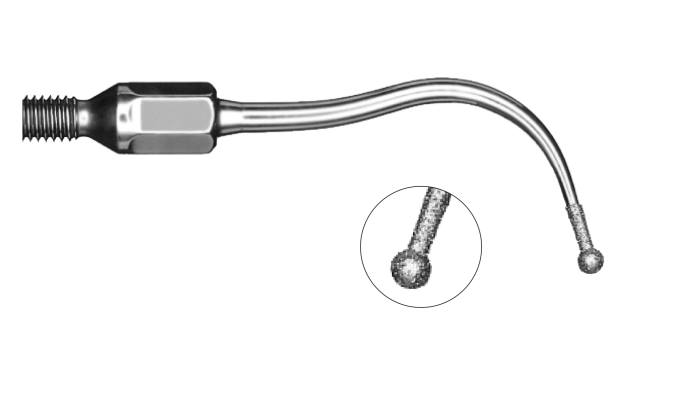 • Behandlung: diamantierte Spitze zum Exkavieren von Karies. Exkavation von kleinen Kariesläsionen und zum Finieren und Präparieren der Kavität. Schnelle und effektive Entfernung des kariösen Materials. Sehr schonend für den Patienten, da keine Vibrationenübertragung. Besonders geeignet für Kinderbehandlung