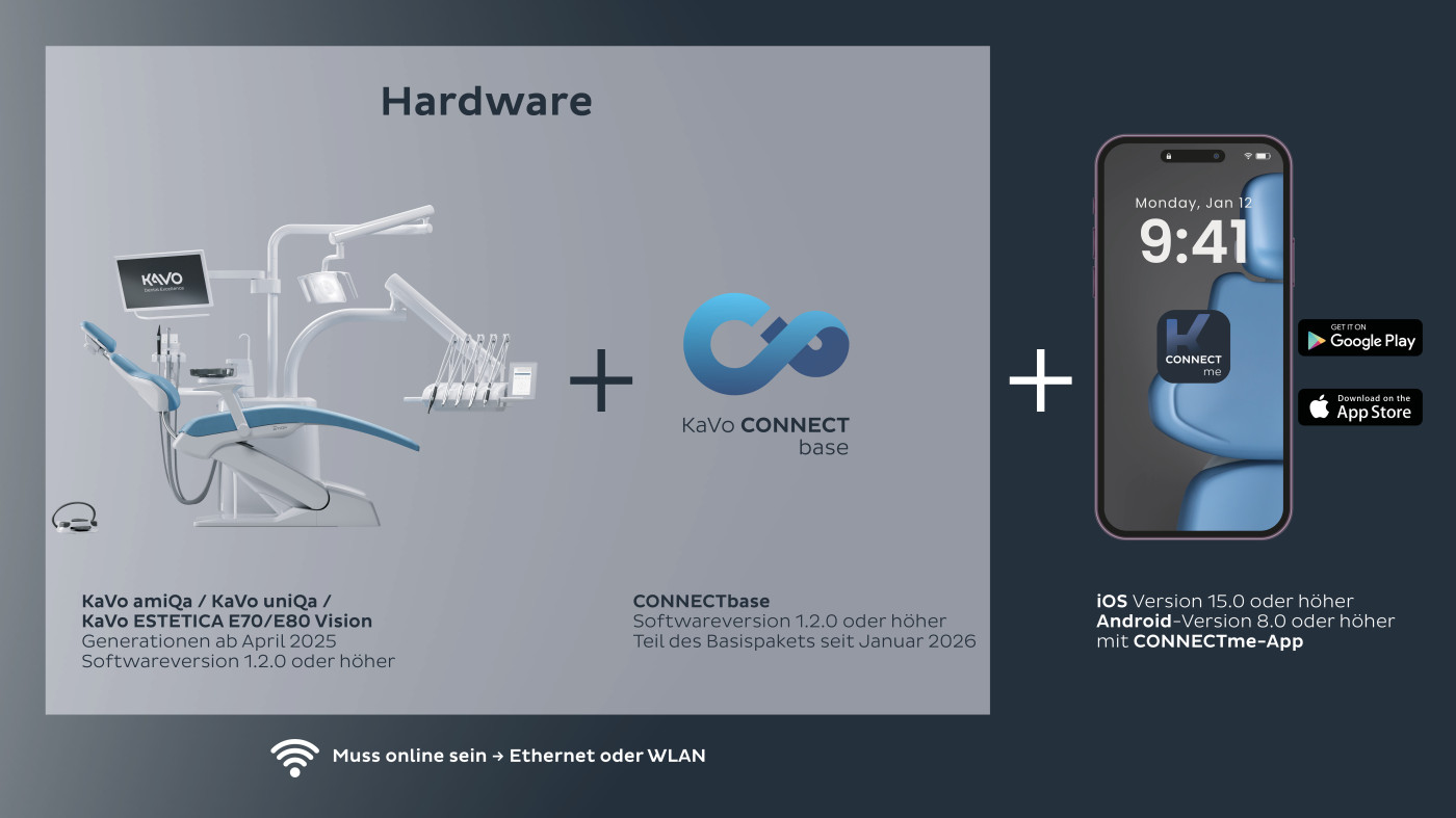 * KaVo CONNECTme ist kompatibel mit den KaVo Dentaleinheiten ESTETICA E70/E80 Vision, uniQa und amiQa. Voraussetzung ist die CONNECTbase ab Version 1.2.0.