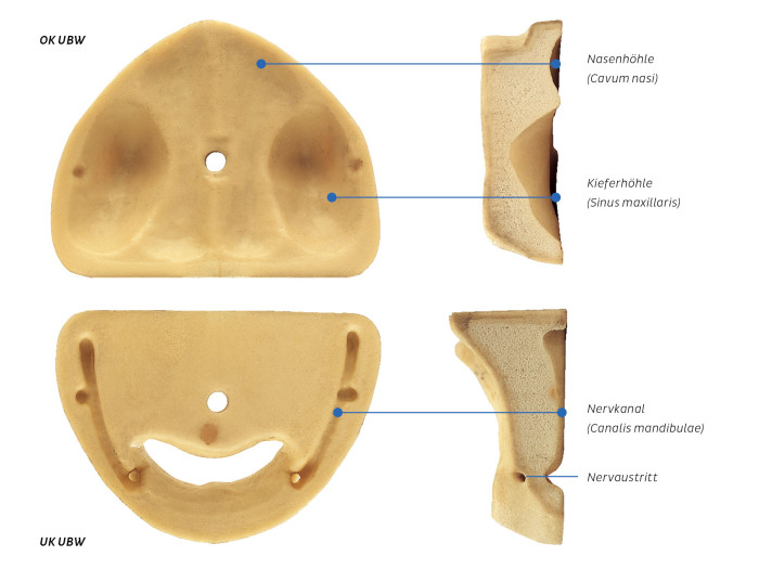Bei diesen Modellen sind die Nasenund Kieferhöhlen im Oberkiefer, sowie die Nervenkanäle im Unterkiefer ausgeformt.