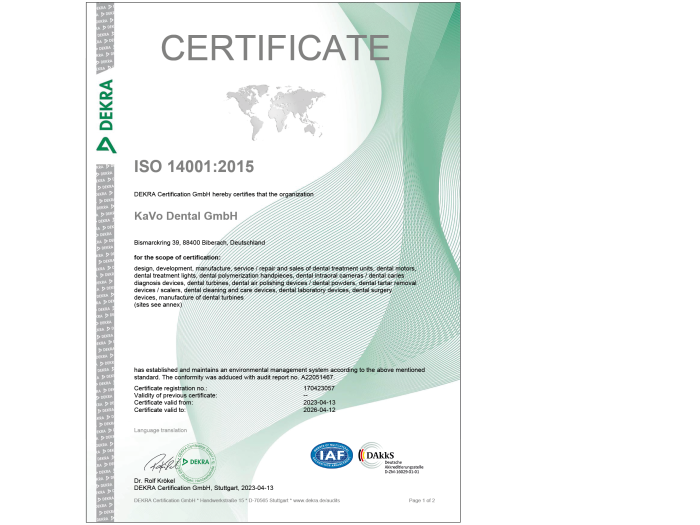 KaVo is committed to excellence in environmental management. Our ambitious, multi-stage environment plan is integrated into our corporate policy and our environmental management system in accordance with DIN EN ISO 14001:2015, and is set to make us more sustainable going forward.