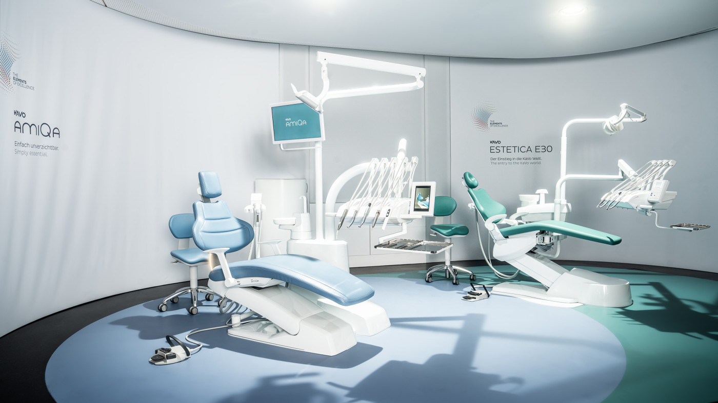 Each dental unit has been given its own platform in the respective launch color. The newly designed lighting puts the units in a great light. The presentation of the redesigned KaVo dental units is completed by the individual claims that are placed behind each dental unit.