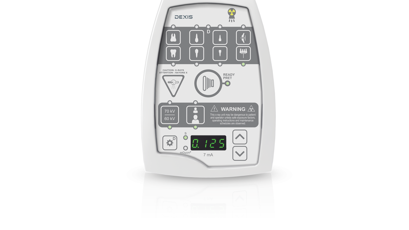 Panel: Intuitiv kontrollpanel med förprogrammerade exponeringsinställningar för alla delar av tanduppsättningen hos både vuxna och barn.