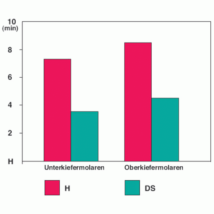 The time outlay for processing molars with furcation infection, during flap surgery with manual instruments (H) and with the diamond-coated air scaler attachments (DS).