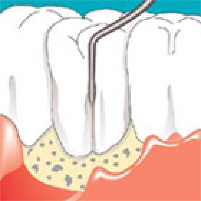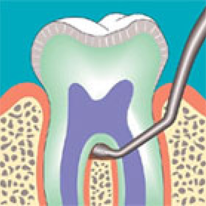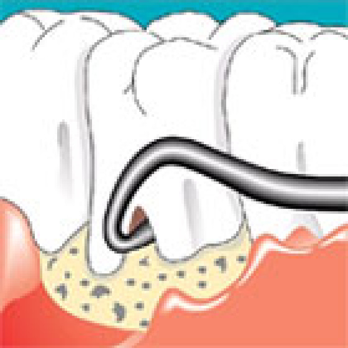 - Cleaning of hard surfaces and of poorly accessible furcation areas to remove hard deposits in open curettage