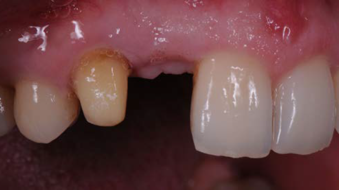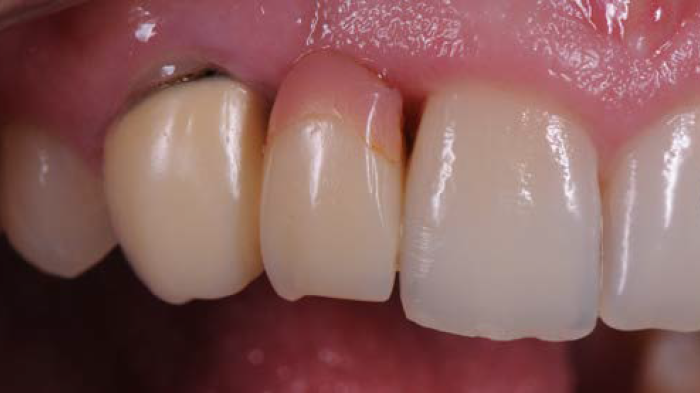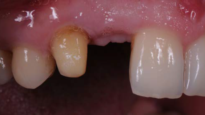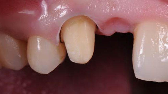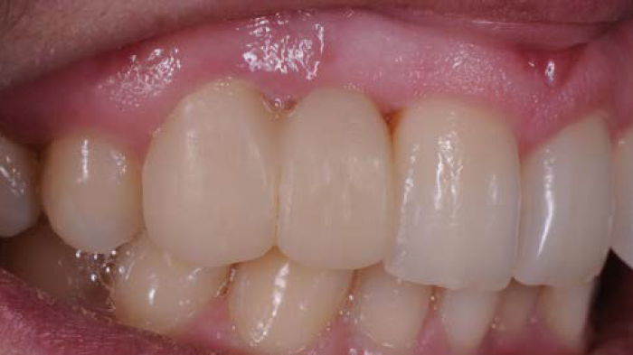 Figures 3 et 4 : après discussion avec la patiente et l'obtention de son consentement, il a été décidé que le traitement consisterait en un remplacement du bridge, sans augmentation des tissus mous de la crête résiduelle. Le bridge existant a donc été retiré, la préparation lourde de la dent-pilier a été épurée, des empreintes et des enregistrements ont été faits, avant de placer un bridge provisoire.