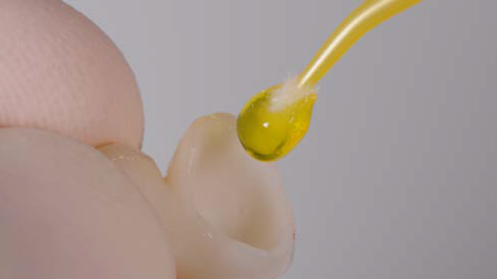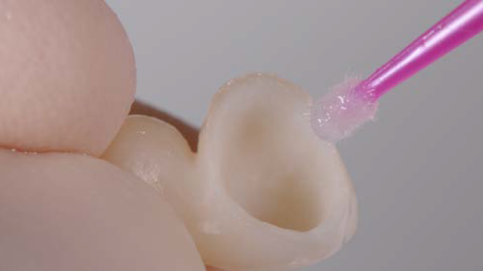 Figures 11 et 12 : après le traitement de la dent par abrasion à air, la surface interne du bridge au disilicate de lithium (eMax) a été traitée par mordançage à l’acide fluorhydrique puis un silane a été appliqué afin d’optimiser l’adhésion.