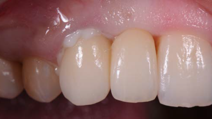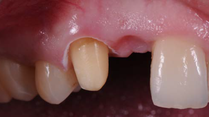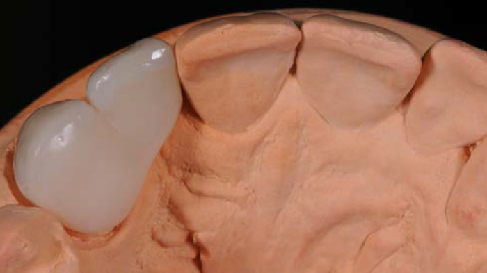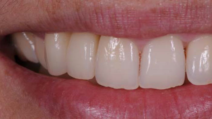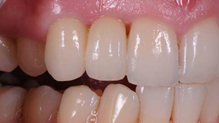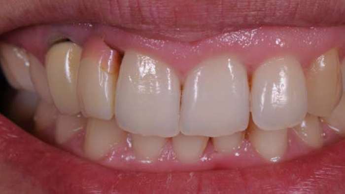 Figures 1 et 2 : la patiente était une jeune femme ayant déjà fait l’objet d’un traitement à l’aide d’un bridge cantilever de deux unités en raison de l’absence congénitale d’incisive latérale maxillaire droite. Bien que la canine constitue une dent-pilier tout à fait adaptée pour ce type de traitement, la dent avait malheureusement été préparée en vue d’une prothèse à recouvrement complet au lieu d’être traitée à l’aide d’une plaque palatine pour un bridge Maryland. La patiente n’était pas satisfaite de l’aspect esthétique de la prothèse existante et recherchait une solution de remplacement.