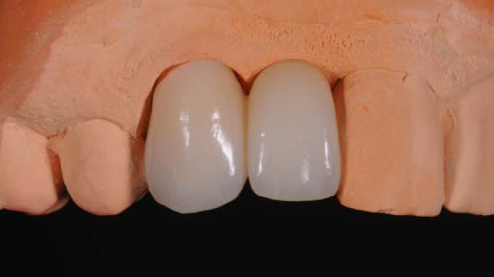 Figures 5 et 6 : le céramiste a ensuite fabriqué le bridge définitif à l’aide d’une armature au disilicate de lithium (eMax) recouverte d’une couche d’eMax Ceram pour un résultat esthétique optimal. Il s’agissait d’un bridge cantilever à deux unités, comparable à l’ancienne prothèse, mais avec une attention particulière portée à la dimension du connecteur pour garantir la solidité de la restauration finale.