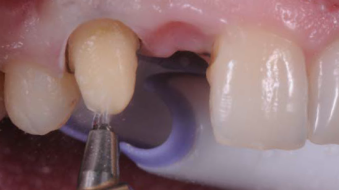 Figure 8 : une fois le processus d’ajustement et de test terminé, la dent-pilier a été nettoyée par abrasion à air avec le RONDOflex 360.