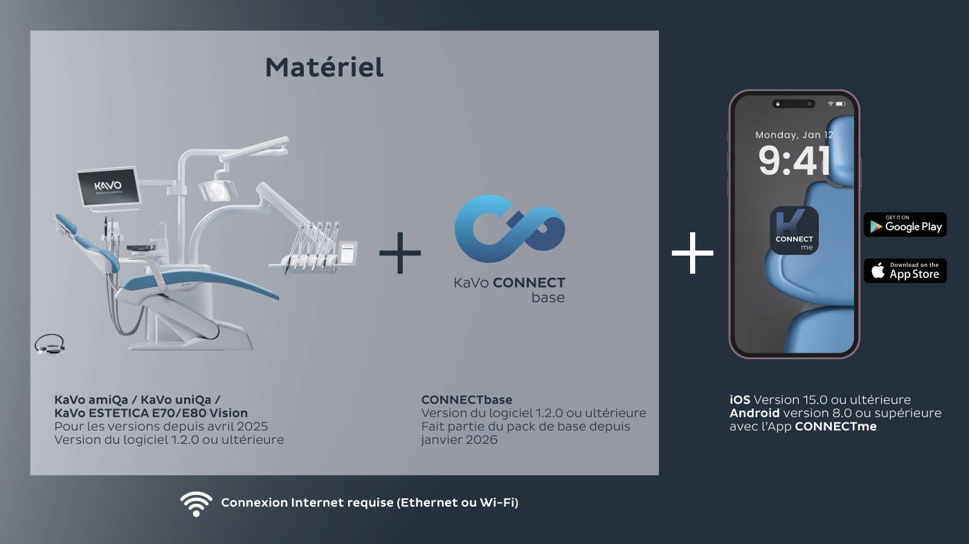 * KaVo CONNECTme est compatible avec les fauteuils dentaires KaVo ESTETICA E70/E80 Vision, uniQa et amiQa.