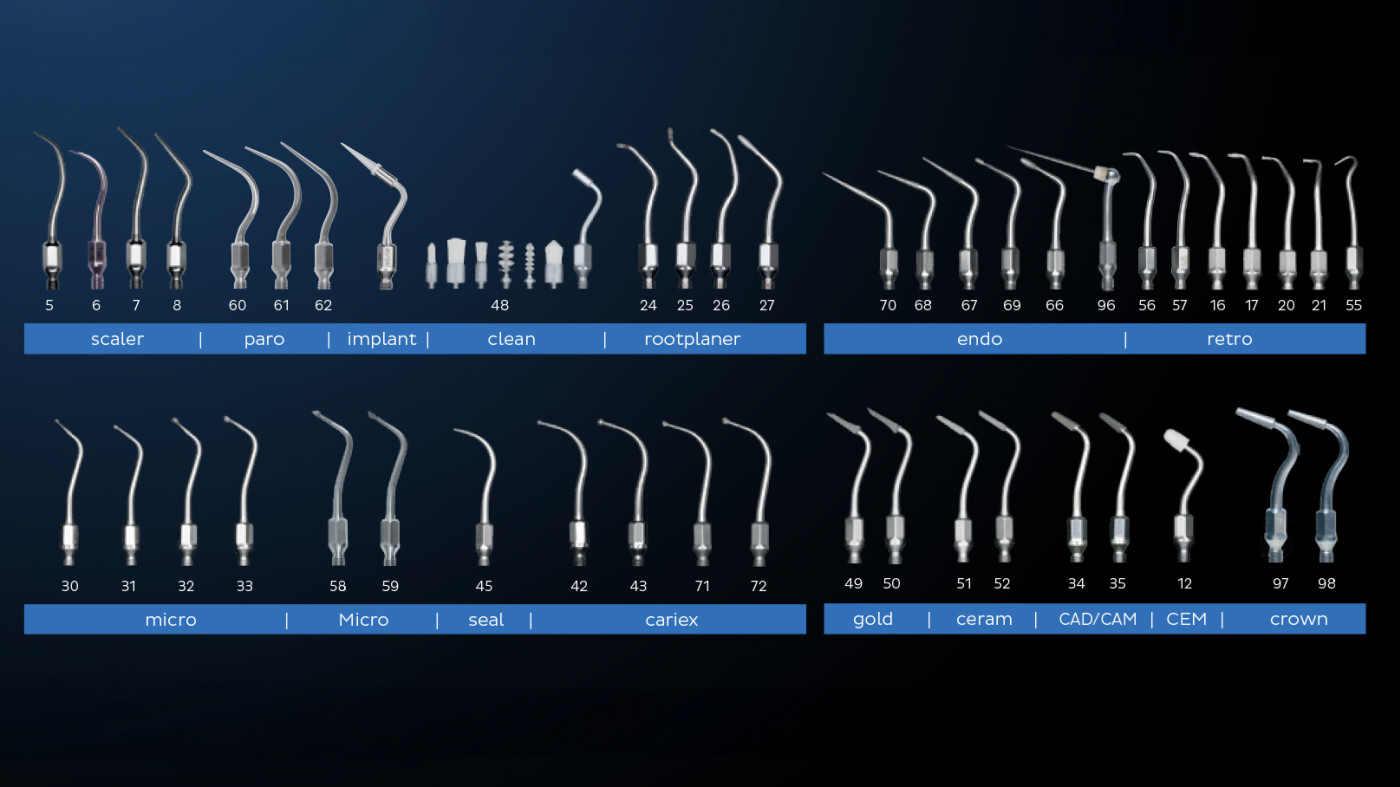De nombreux inserts différents, faciles et rapides à remplacer. Pour tous les domaines d'application : Prophylaxie, Parodontologie, Intervention Mini-Invasive, Prothèse Dentaire, Résection Apicale, Endodontie.