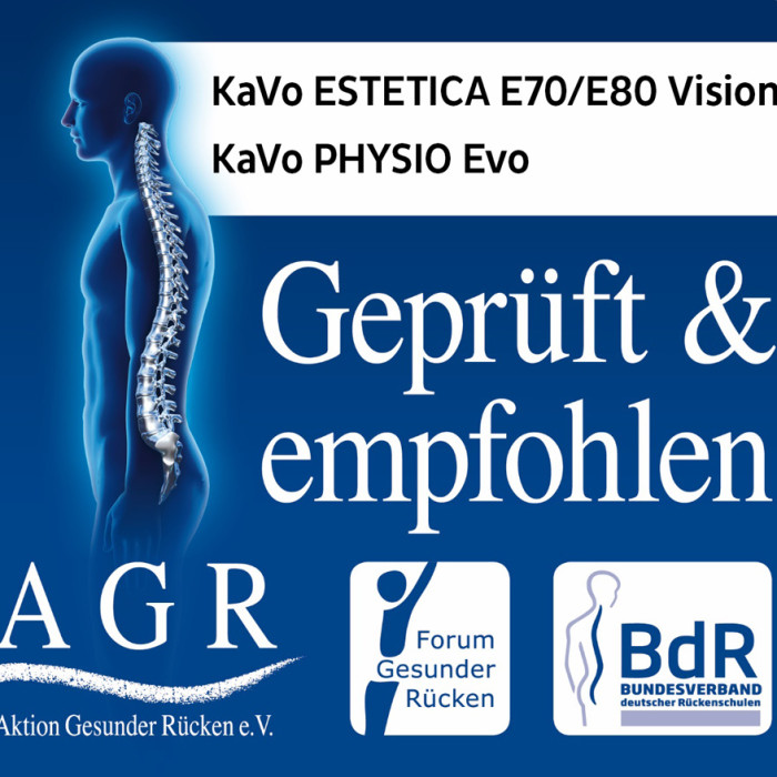 Il sigillo di qualità AGR (Aktion Gesunder Rücken - Campagna per una schiena più sana) è stato assegnato ai riuniti KaVo ESTETICA E70/E80 Vision e ai seggiolini KaVo PHYSIO Evo ed Evo F.
