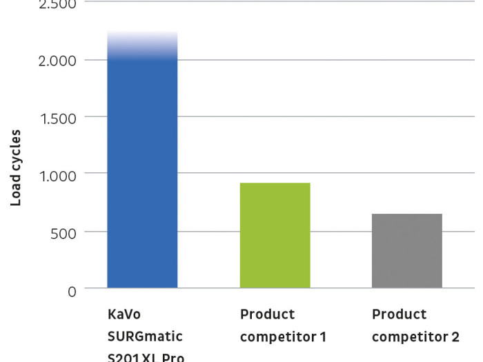 Doskonała kompatybilność wierteł i narzędzi do wkręcania w połączeniu ze zwiększonymi momentami obrotowymi zmniejsza obciążenie uchwytu narzędzia, a tym samym zużycie i zniszczenia podczas pracy. Zastosowane rozwiązania zwiększają liczbę zabiegów wykonywanych tym samym zestawem narzędzi z wykorzystaniem maksymalnego momentu obrotowego do ponad 2000 razy, co znacznie przewyższa standardy rynkowe – trwałość typowa dla KaVo.