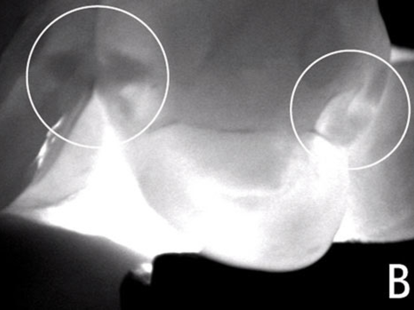 Соответственно, в профилактических целях фиссуры часто герметизируют. В данном случае классическая диагностика кариеса затруднена (А). При исследовании DIAGNOcam точно определяются очаги кариозных затемнений (см. круг B), которые были обнаружены и на рентгеновском снимке.