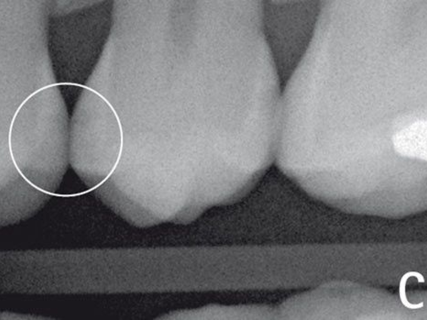 На рис. (А) представлены премоляры, которые кажутся клинически здоровыми. Затемненные участки заметны только на рисунке (B) (левый и правый круг), полученном при помощи DIAGNOcam. Кариозные изменения также заметны на рентгеновских снимках на задней поверхности. С помощью рентгеновского излучения переднюю область зуба оценить не всегда возможно в связи с эффектом частичного наложения (C), которое возникает довольно часто.