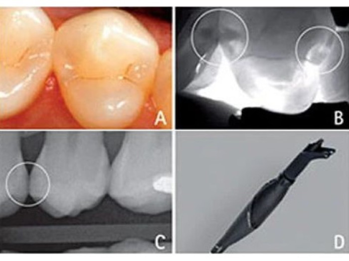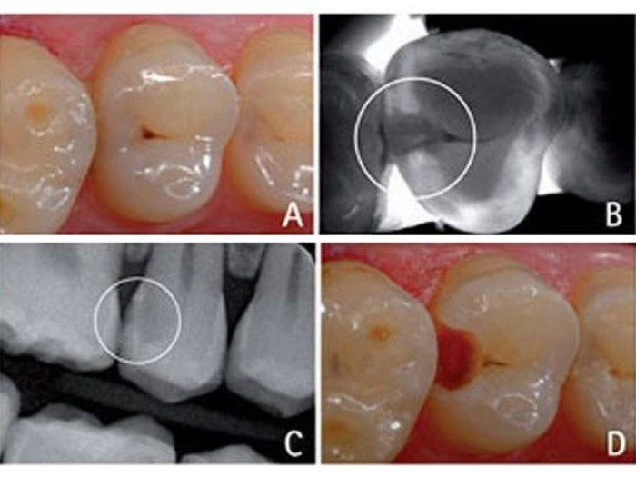 При исследования DIAGNOcam обнаружен обширный кариозный очаг, клинически не выявленный (B). Такие повреждения можно обнаружить и при рентгеновском исследовании (C). В данном случае было принято решение об экскавации кариозной области с применением традиционных ротационных боров и последующей реставрацией композитным материалом. На изображении (D) показано, как выглядел зуб до процедуры пломбирования.