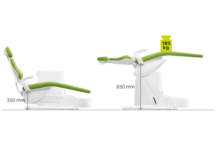 - Кресло для пациента с плавной регулировкой (нижнее положение: 350 мм; верхнее положение: 830 мм)