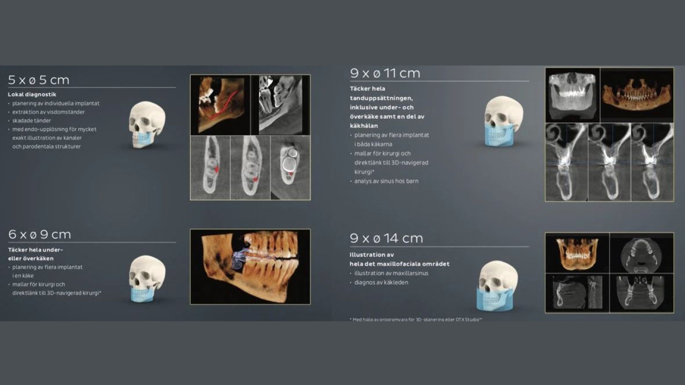 Synfältet 6 x ø 9 cm möjliggör skanning av antingen överkäken eller underkäken, medan synfält 9 x ø 11 cm kombinerar båda. Det största synfältet är 9 x ø 14 cm, vilket möjliggör undersökning av käkled.