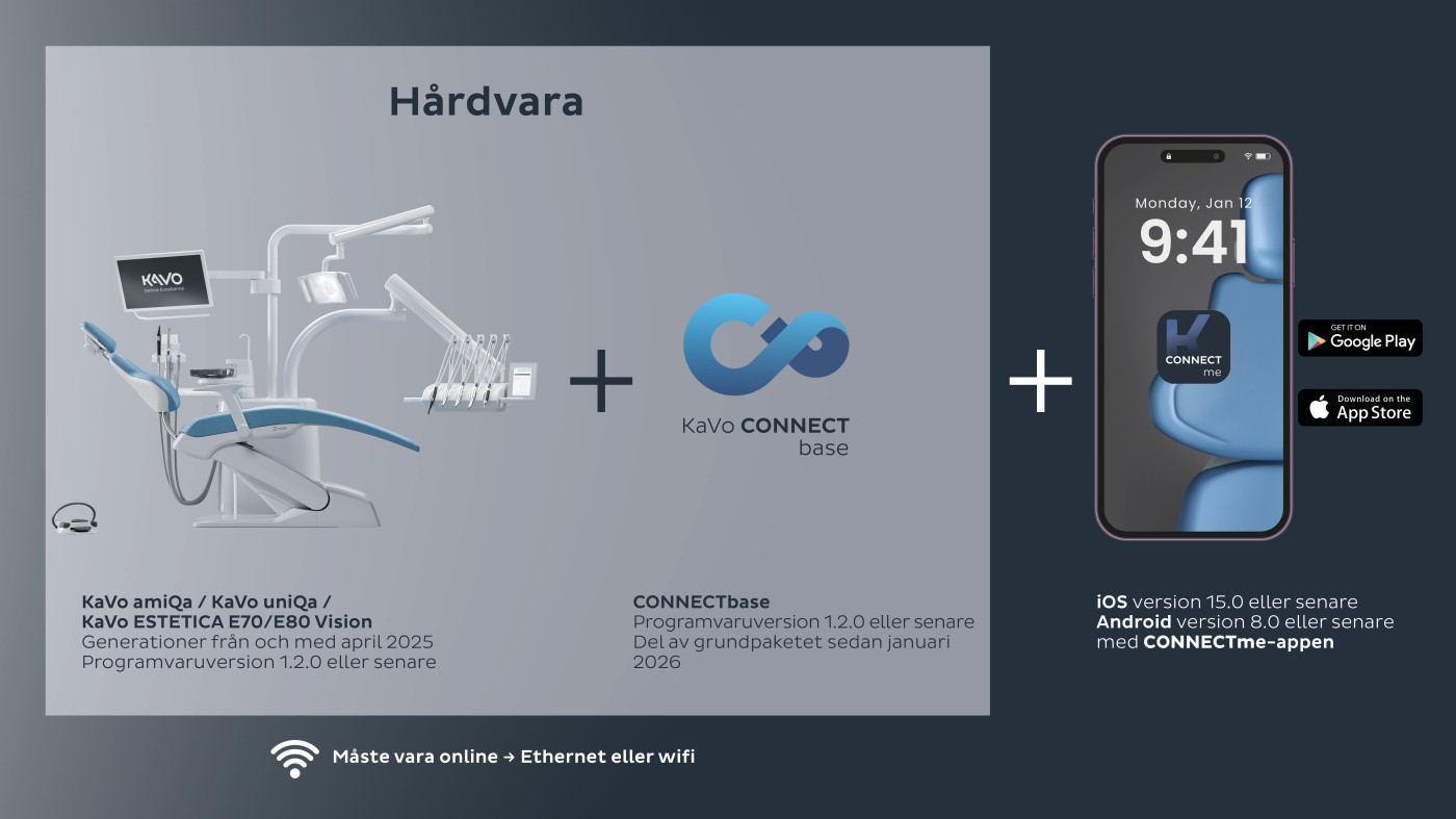 * KaVo CONNECTme är kompatibel med ESTETICA E70/E80 Vision, uniQa och amiQa behandlingsstolar från KaVo. CONNECTbase version 1.2.0 eller senare krävs.