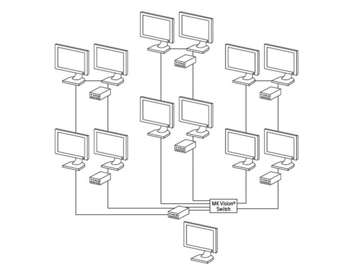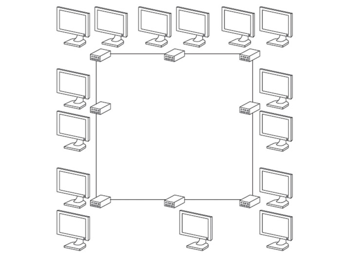 Advantage: instead of a pure star, or ring wiring, it is possible to combine the two. Via a central unit, individual branches can be created to multiple units, or sub-rings can be formed. This means that even a star network is possible, without requiring thick cable looms.
